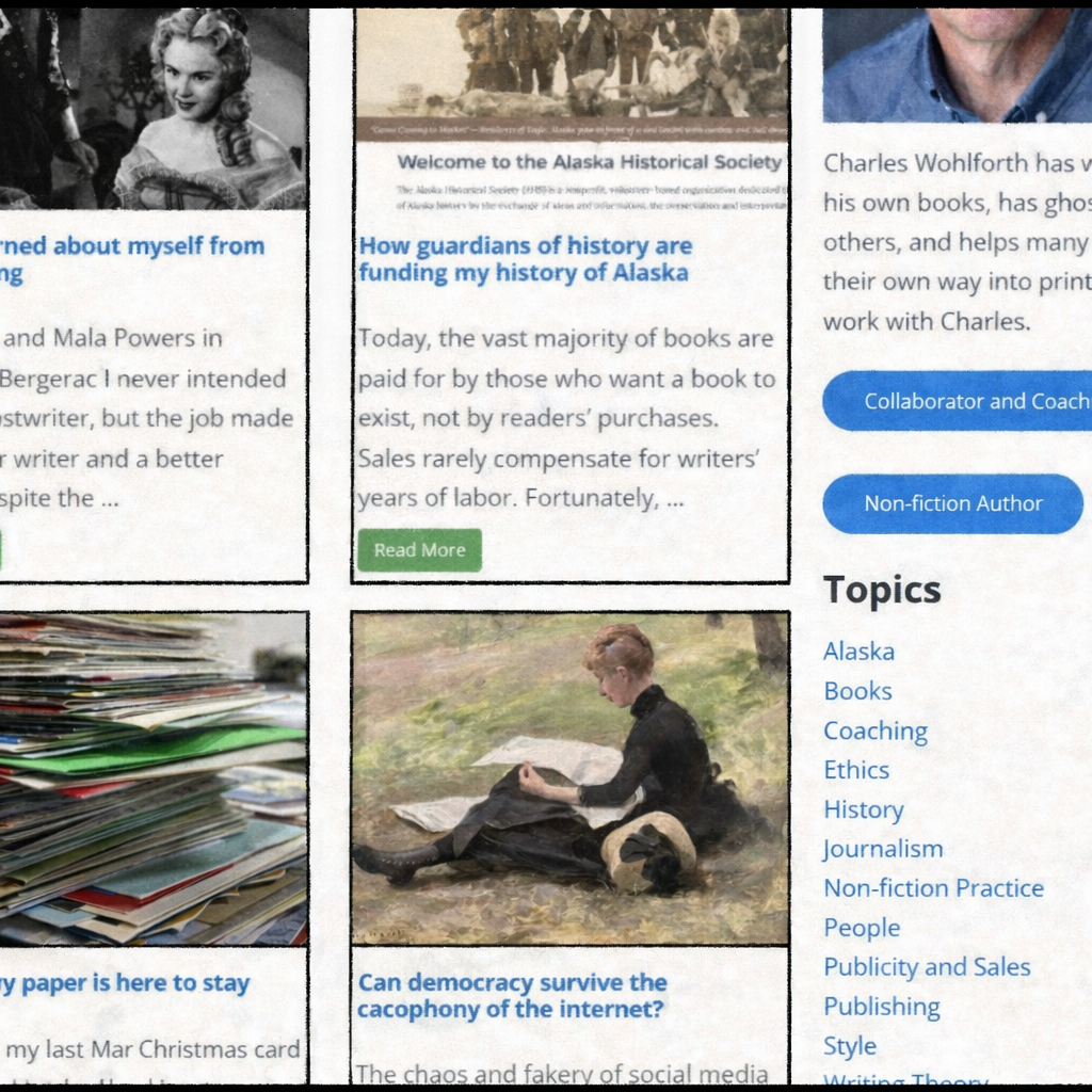 My investment in this exchange is to think of interesting things to say about the literary topics I have chosen: Alaska, books, coaching, ethics, history, journalism, non-fiction practice, people, publicity and sales, publishing, style, and writing theory (all the pieces are cataloged by these subjects).